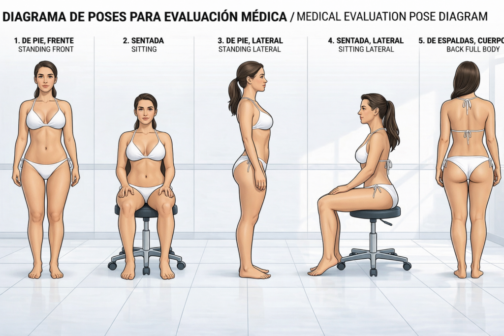 For photos, depending on the procedure you want, place yourself on a preferably white background in a place with good lighting. You should send the photos without clothes to get a valuation and quote as close to reality as possible. One standing in front, the other sitting. Lateral standing, another sitting. The last one from back to full body.
